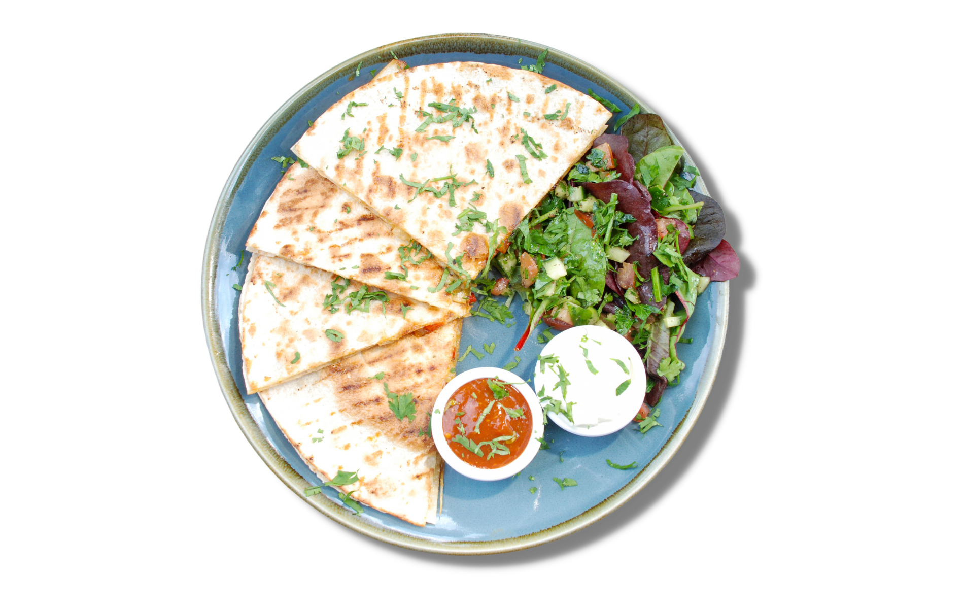 podwójna tortilla zapiekana z serem, szynką i pieczarkami -